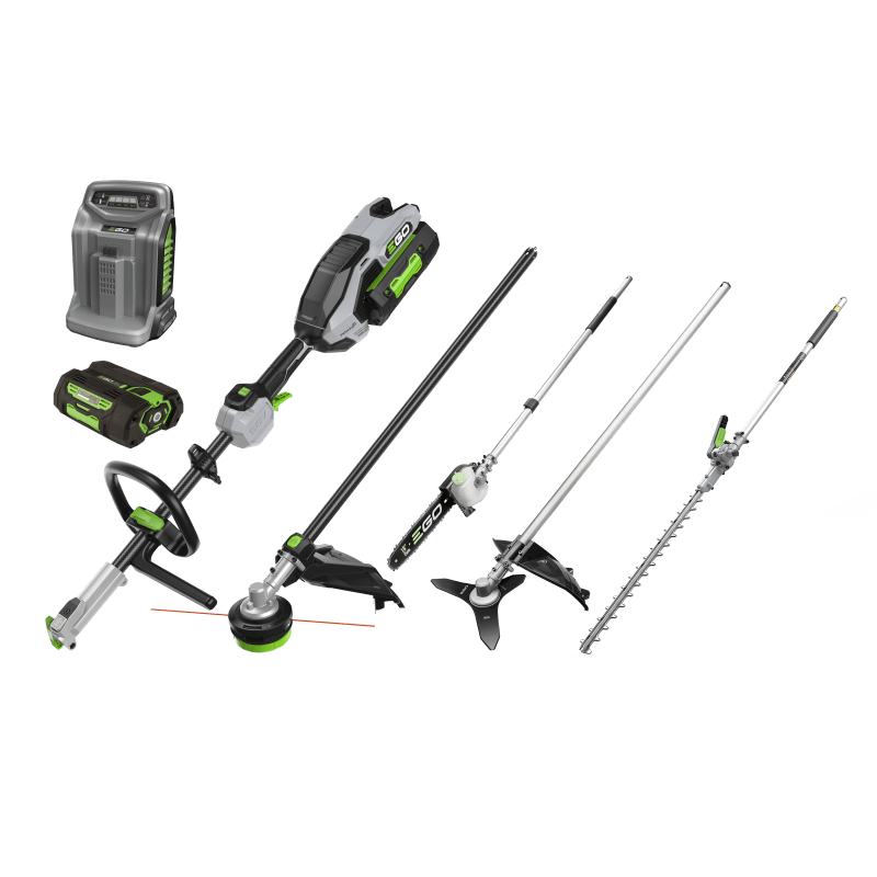 Le multi-outil EGO comprend une machine de base (PH1420E) à laquelle il est possible de connecter de nombreux accessoires différents. Cet ensemble est composé des produits suivants : Machine de base PH1420E, partie taille-haie HTA2000, partie débroussailleuse BCA1200, scie d’élagage à bâton PSA1000, coupe-herbe STA1600, batterie 5 aH BA2800, chargeur rapide 500W CH5500 et une seule bandoulière.