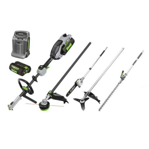 Le multi-outil EGO comprend une machine de base (PH1420E) à laquelle il est possible de connecter de nombreux accessoires différents. Cet ensemble est composé des produits suivants : Machine de base PH1420E, partie taille-haie HTA2000, partie débroussailleuse BCA1200, scie d’élagage à bâton PSA1000, coupe-herbe STA1600, batterie 5 aH BA2800, chargeur rapide 500W CH5500 et une seule bandoulière.